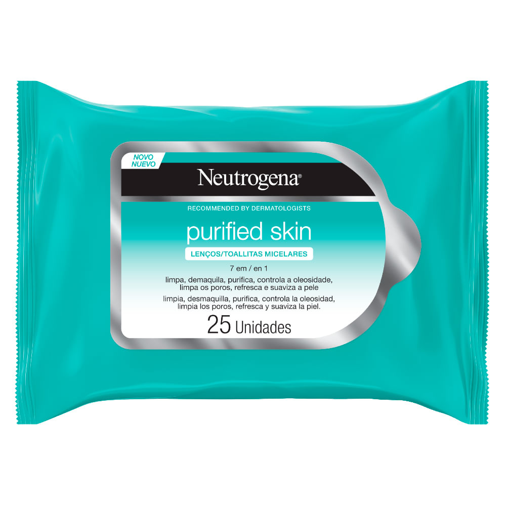 5. Lenços Micelares Purified Skin 7 em 1 da Neutrogena: “lencinhos que proporcionam 7 benefícios; eles limpam, demaquilam, controlam a oleosidade, desobstruem os poros, purificam, refrescam e suavizam em um único passo”.